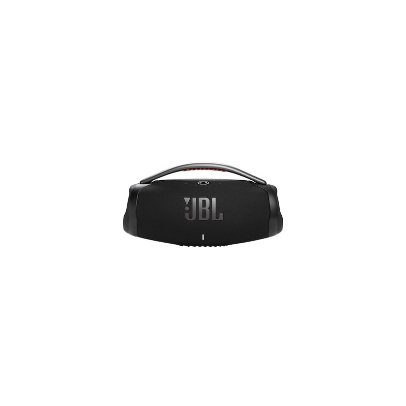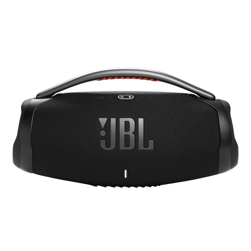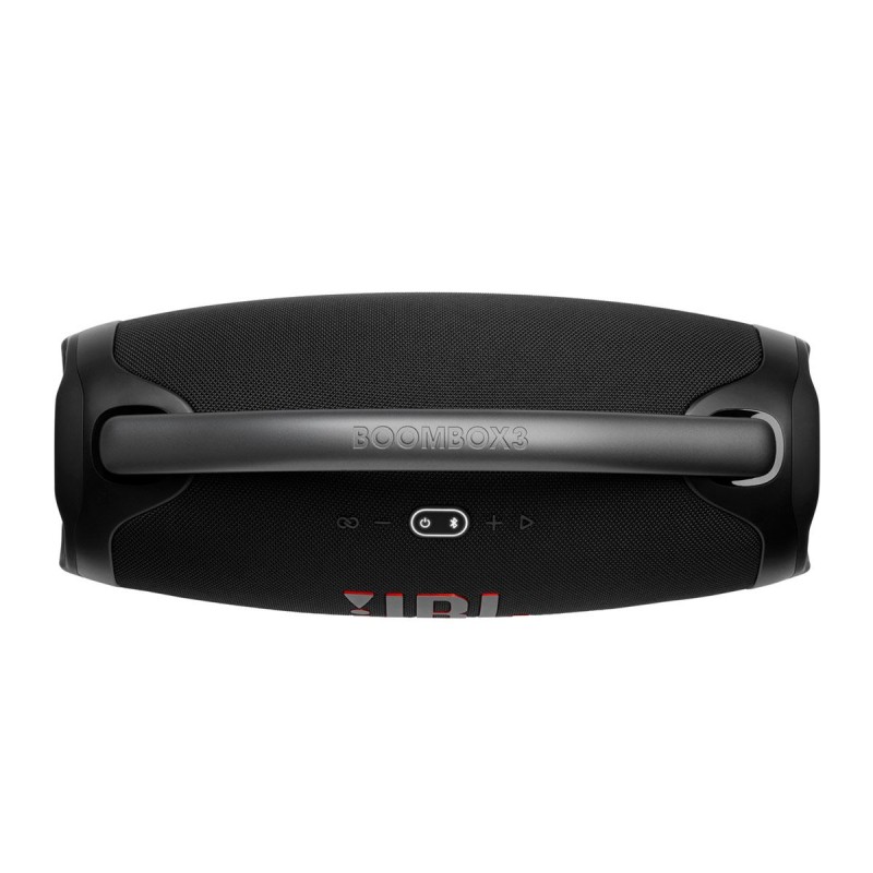 Sonido masivo para todo el día. Acabamos de mejorar aún más nuestro altavoz bluetooth portátil más potente. La silueta icónica del JBL Boombox 3 tiene una nueva y audaz actualización que presenta un mango de metal resistente con agarraderas de silicona, tapas laterales dobles y tela distintiva a prueba de agua y polvo. También se ha rediseñado por dentro, se le ha añadido un nuevo subwoofer que libera unos graves mucho más profundos y un JBL Original Pro Sound enorme, todo con una distorsión más baja. Y 24 horas de tiempo de juego te llevan desde tu entrenamiento matutino hasta un rato nocturno con tus amigos. Y para disfrutar de un sonido prácticamente ilimitado, conecte al instante varios altavoces con la aplicación JBL portable.